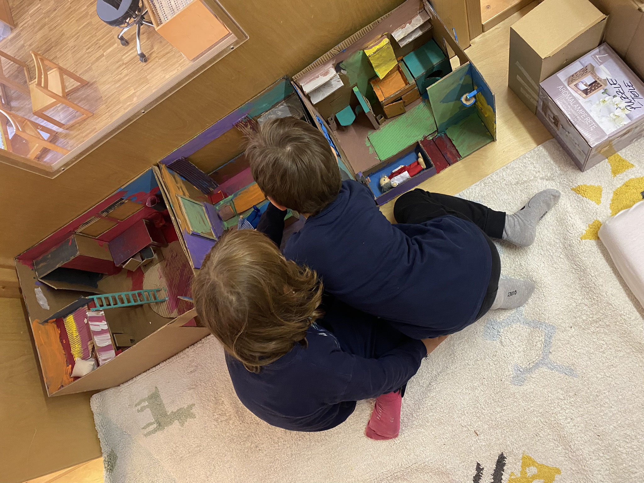 Zwei Kinder haben sich von der Idee inspirieren lassen und aus einem Karton ein Haus für ihre Kuscheltiere gebaut.