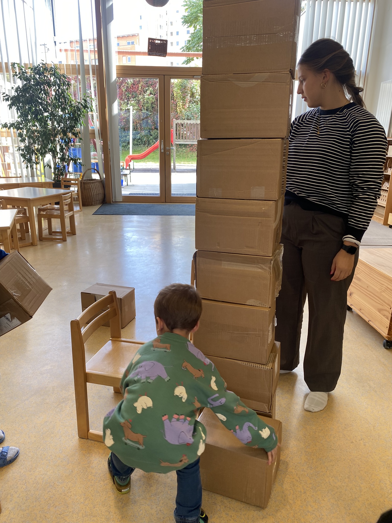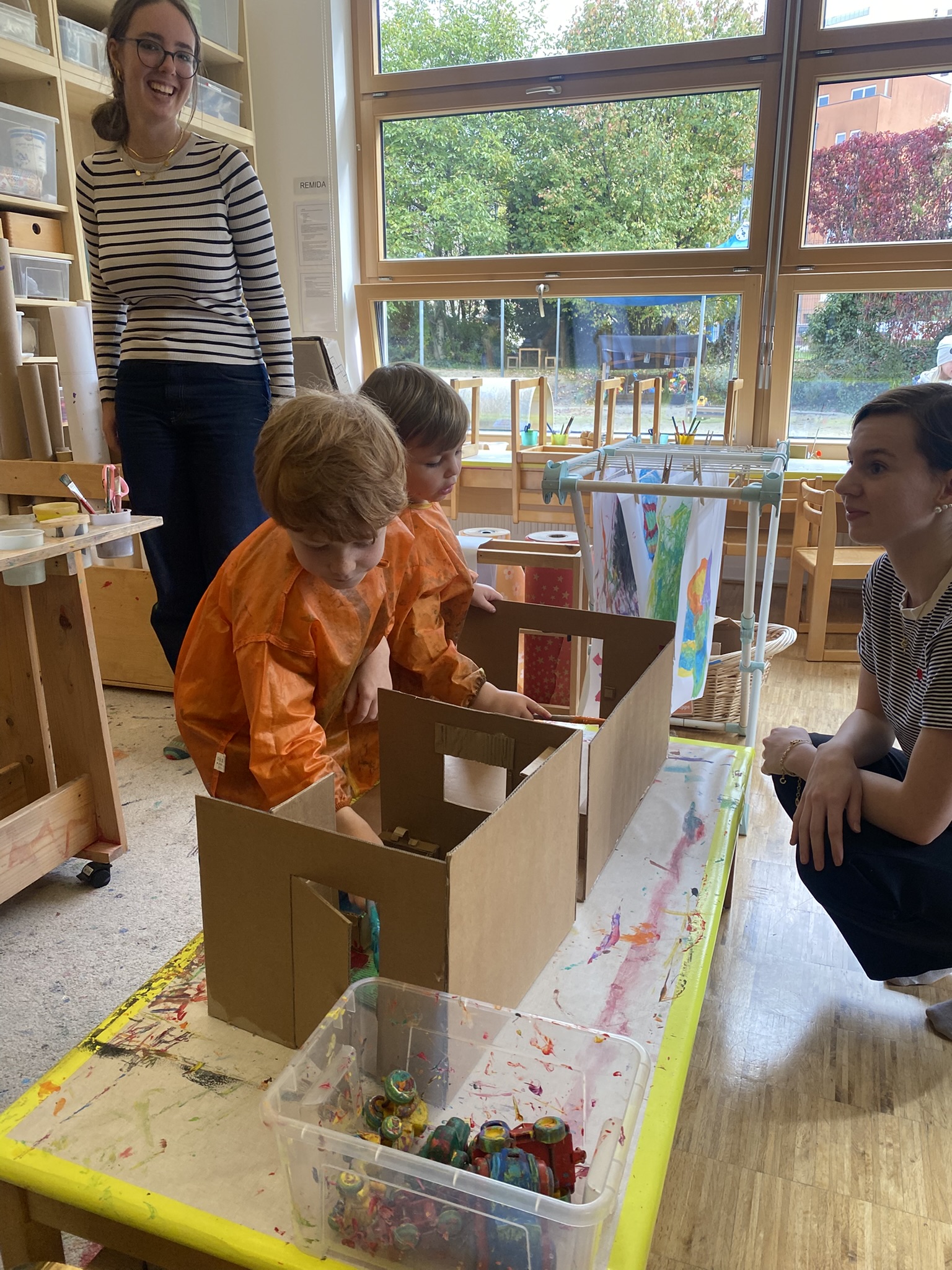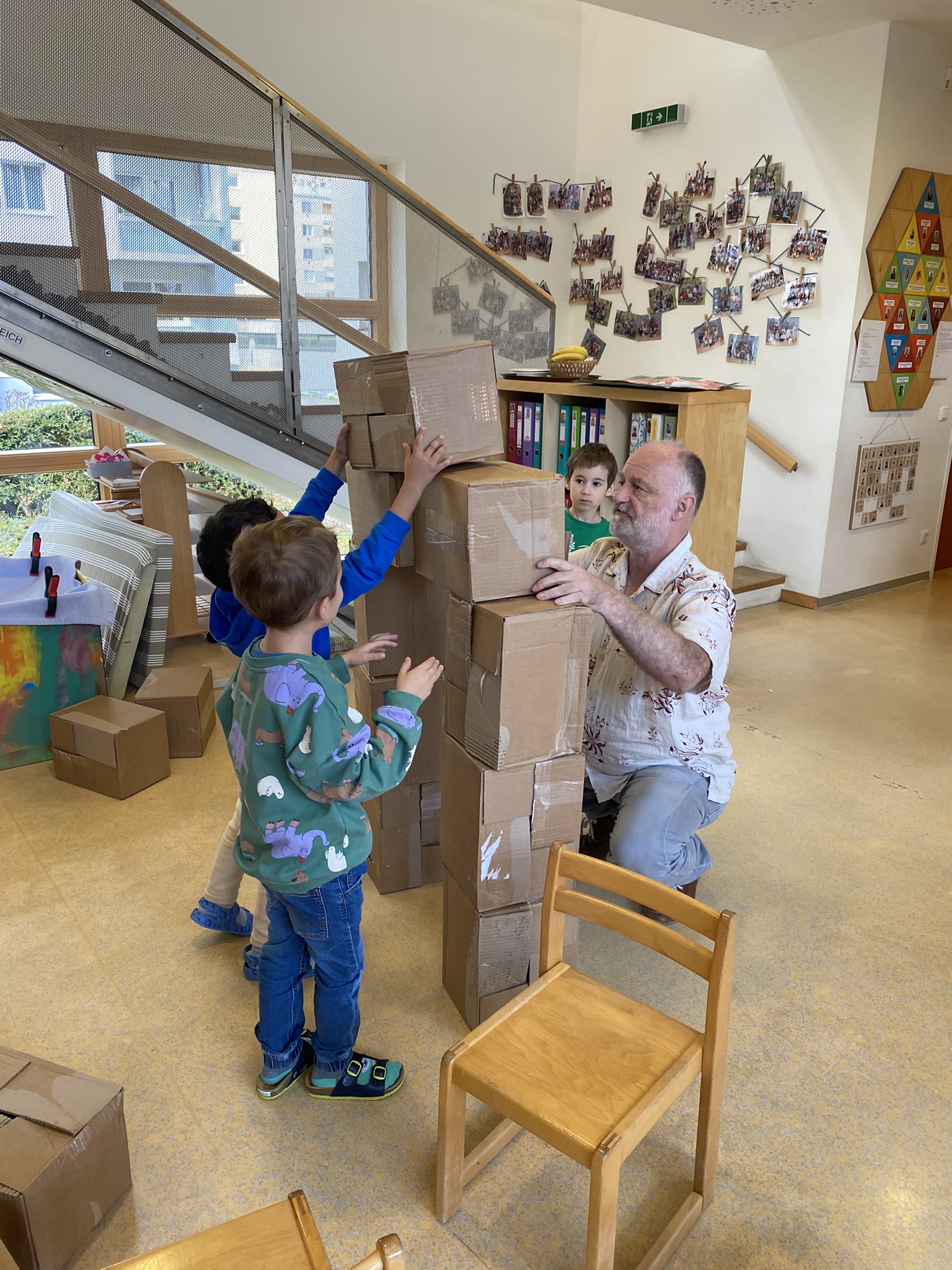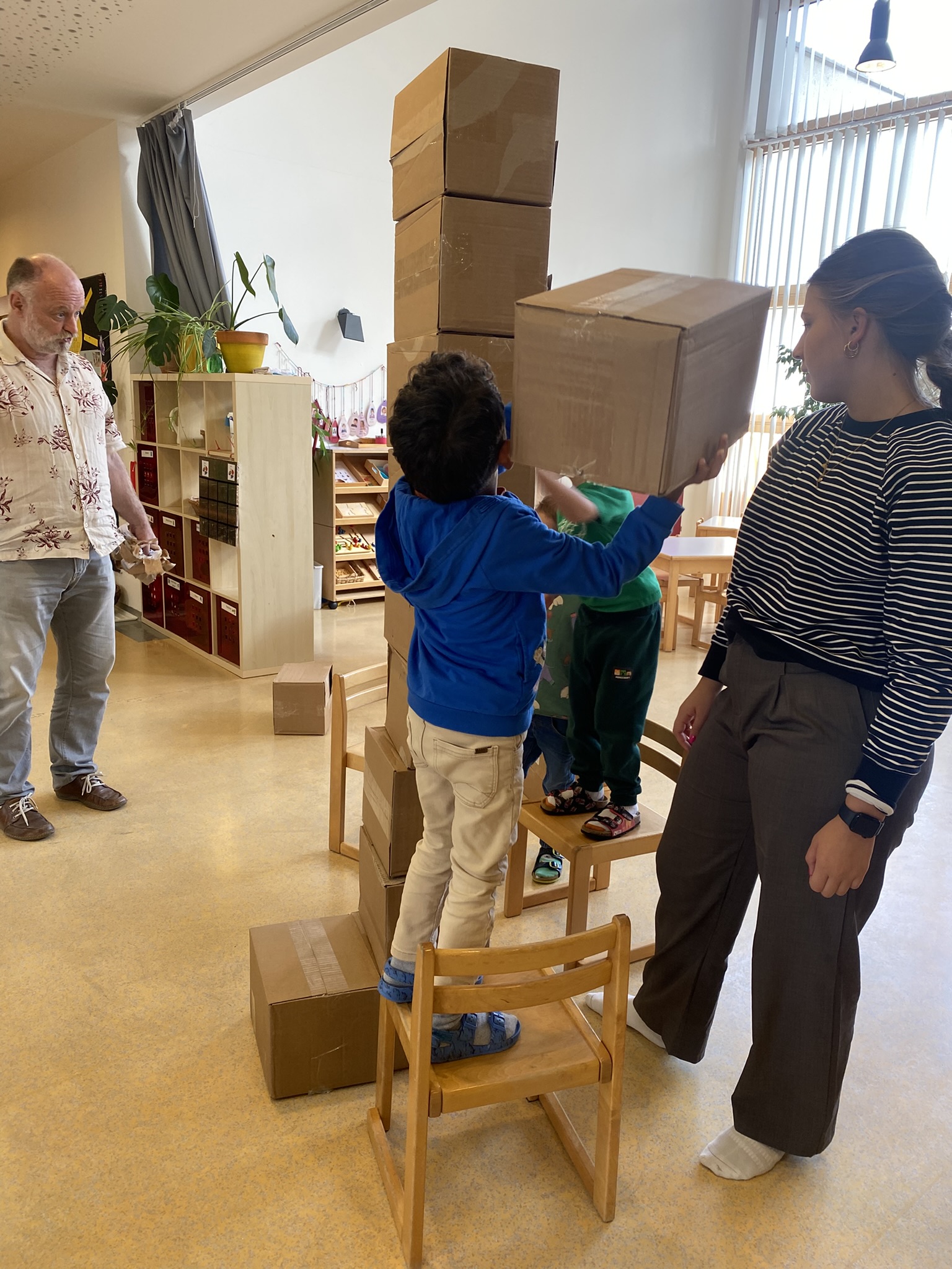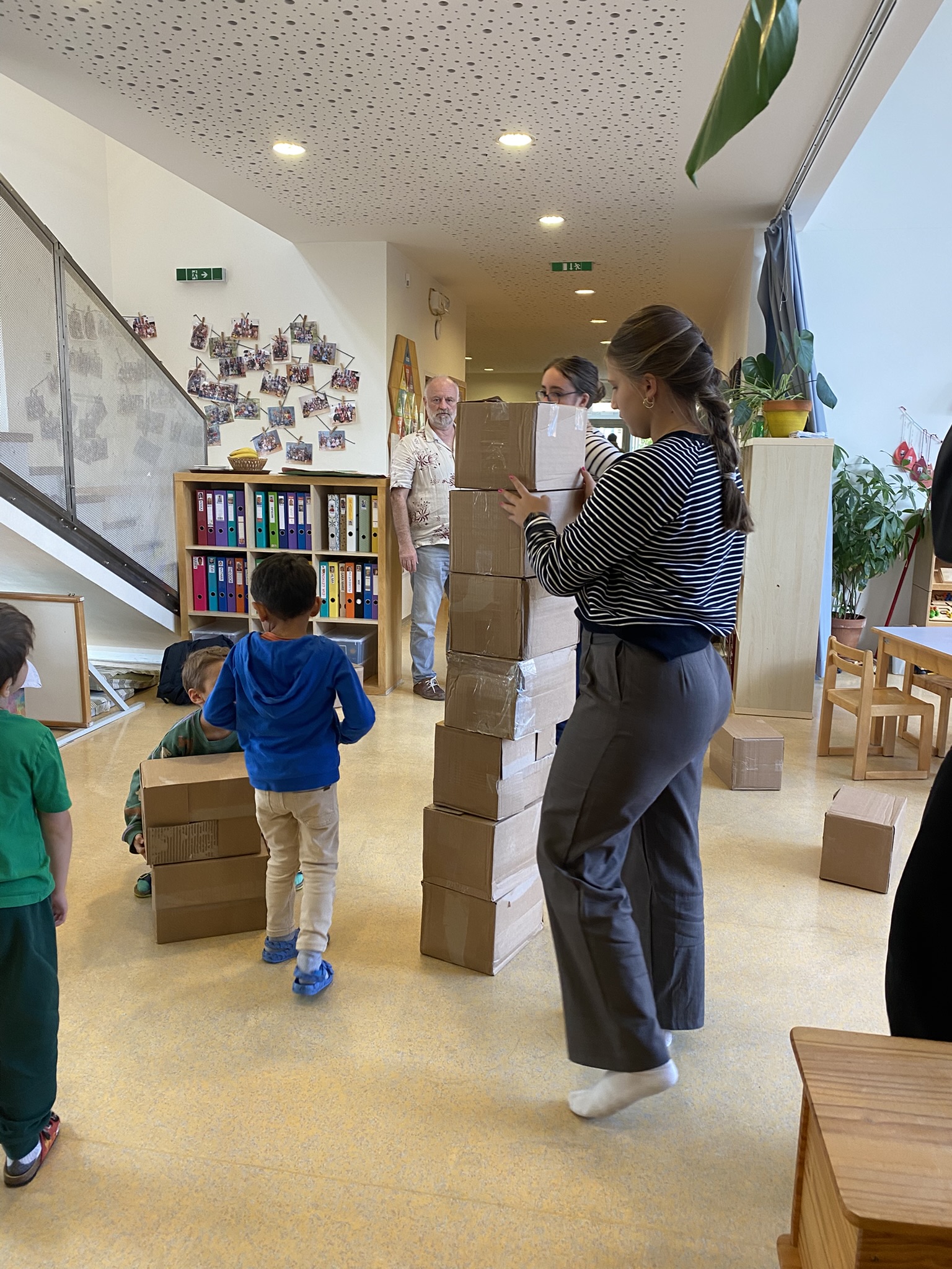 Im Atelier machten sich die ersten Kinder ans Werk und die einzelnen Zimmer der Wohnung wurden bunt angemalt. Andere Kinder wollten das Bilderbuch betrachten und in der Aula bauten die Schüler:innen und Rudi gemeinsam mit den Kindern einen riiiiiesengroßen Turm, der bis zur Decke reichte. Auch andere Bauexperimente werden ausprobiert. Es wurde gespielt und gelacht. Die Kinder hatten dabei sichtlich großen Spaß.