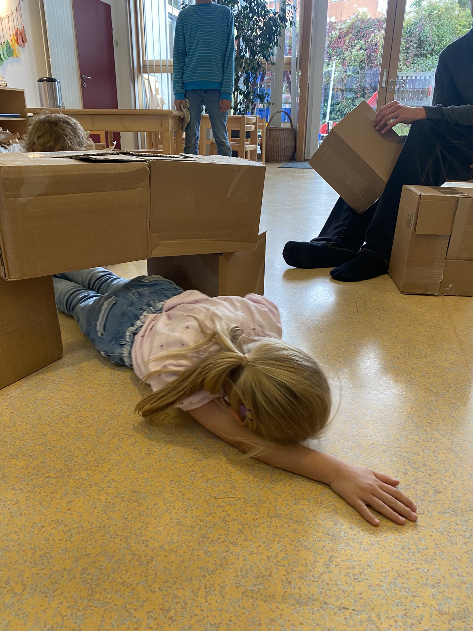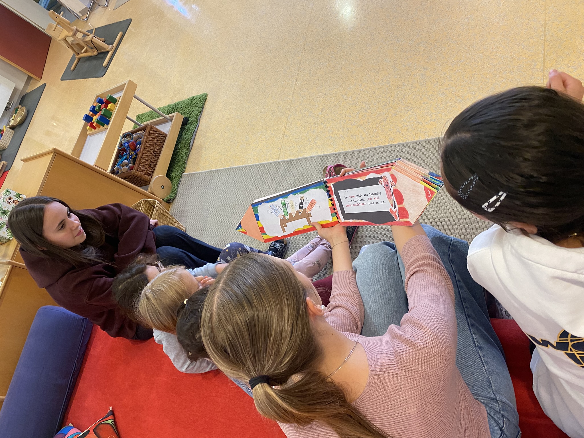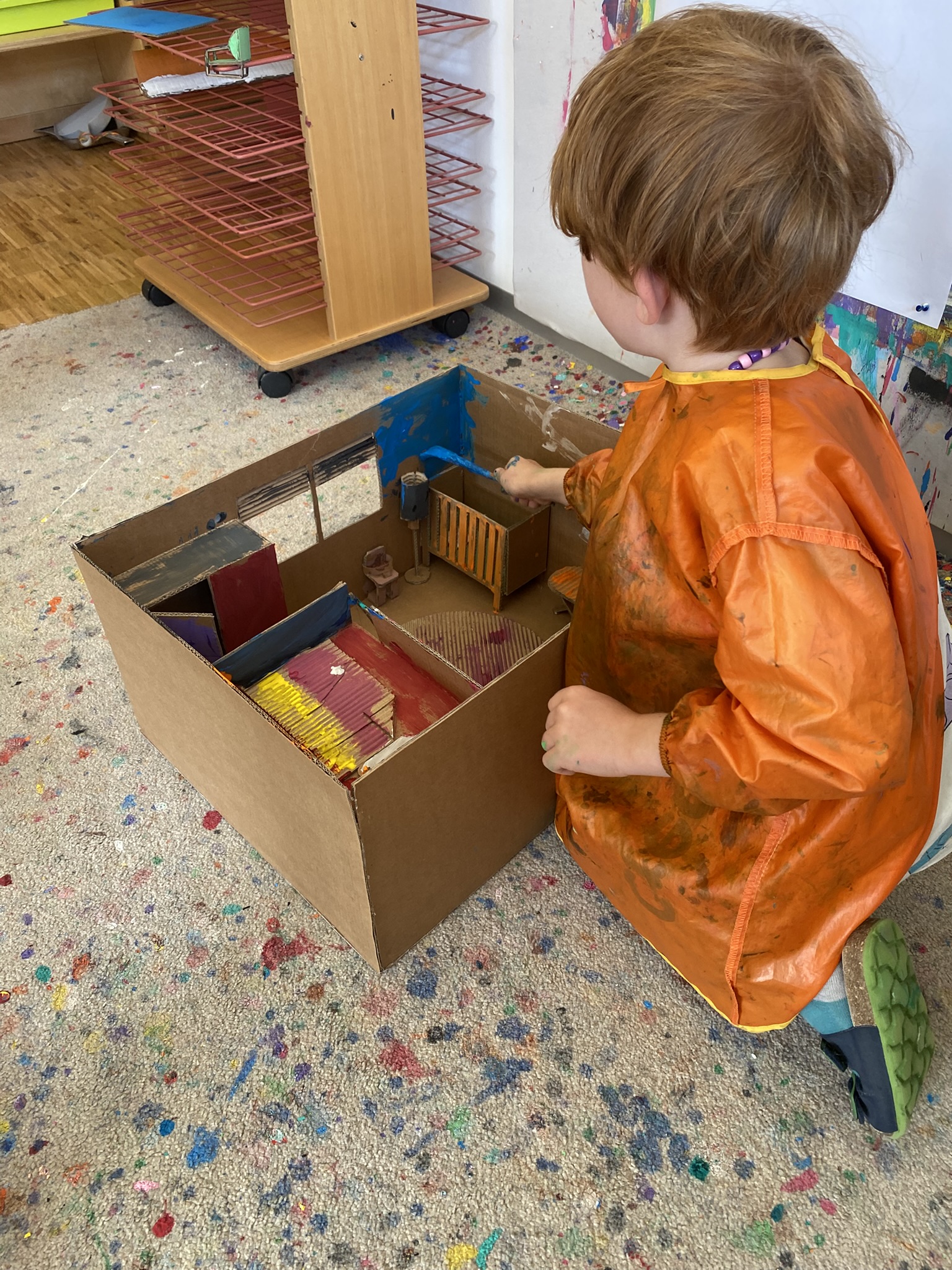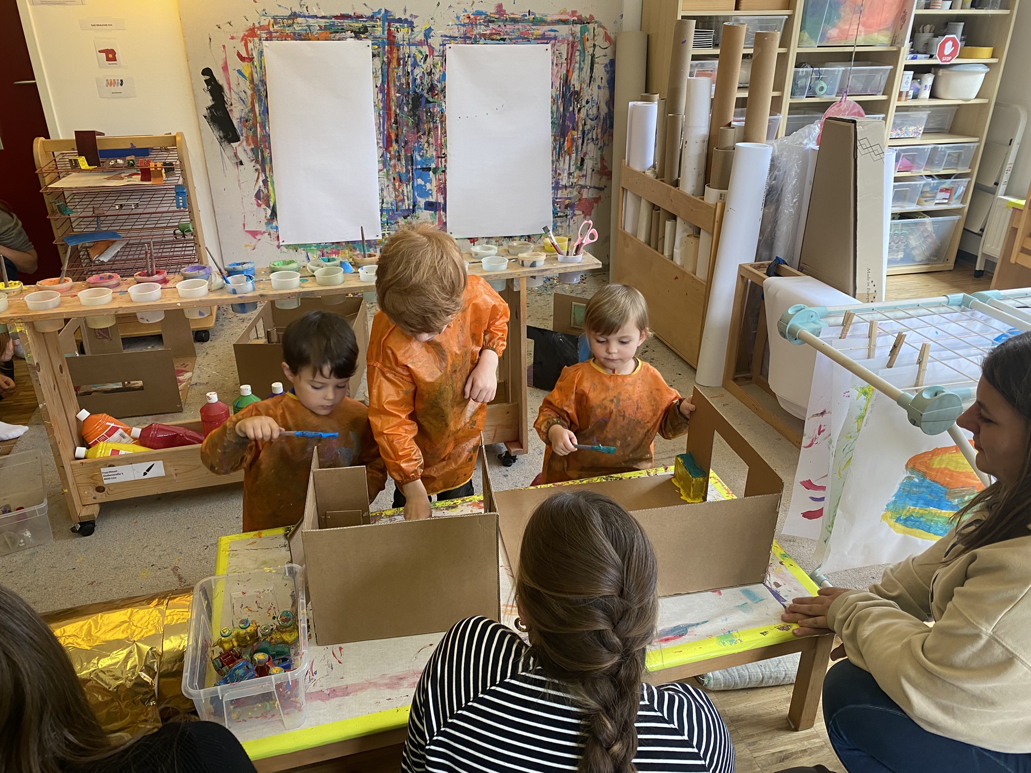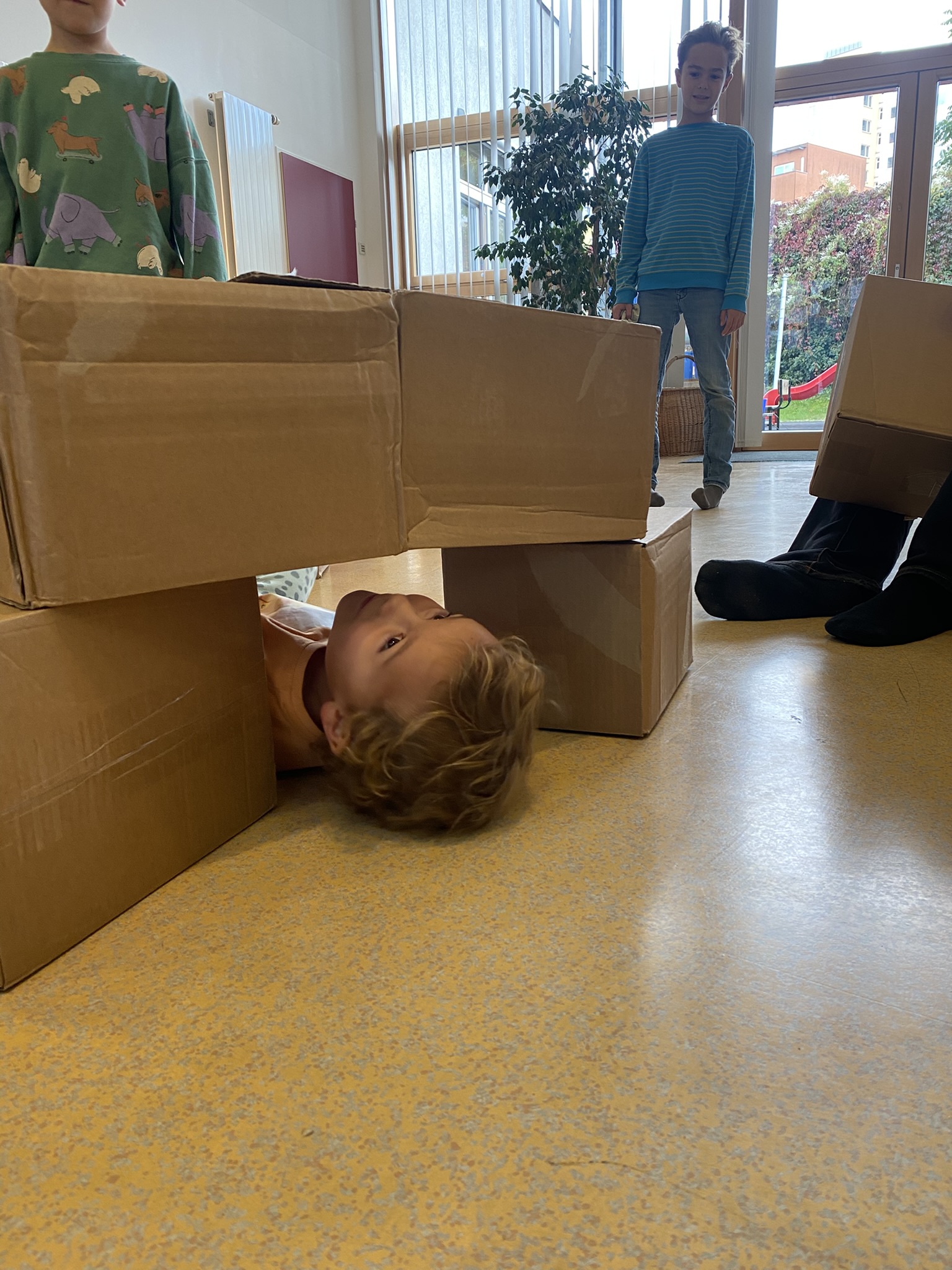 Im Atelier machten sich die ersten Kinder ans Werk und die einzelnen Zimmer der Wohnung wurden bunt angemalt. Andere Kinder wollten das Bilderbuch betrachten und in der Aula bauten die Schüler:innen und Rudi gemeinsam mit den Kindern einen riiiiiesengroßen Turm, der bis zur Decke reichte. Auch andere Bauexperimente werden ausprobiert. Es wurde gespielt und gelacht. Die Kinder hatten dabei sichtlich großen Spaß.