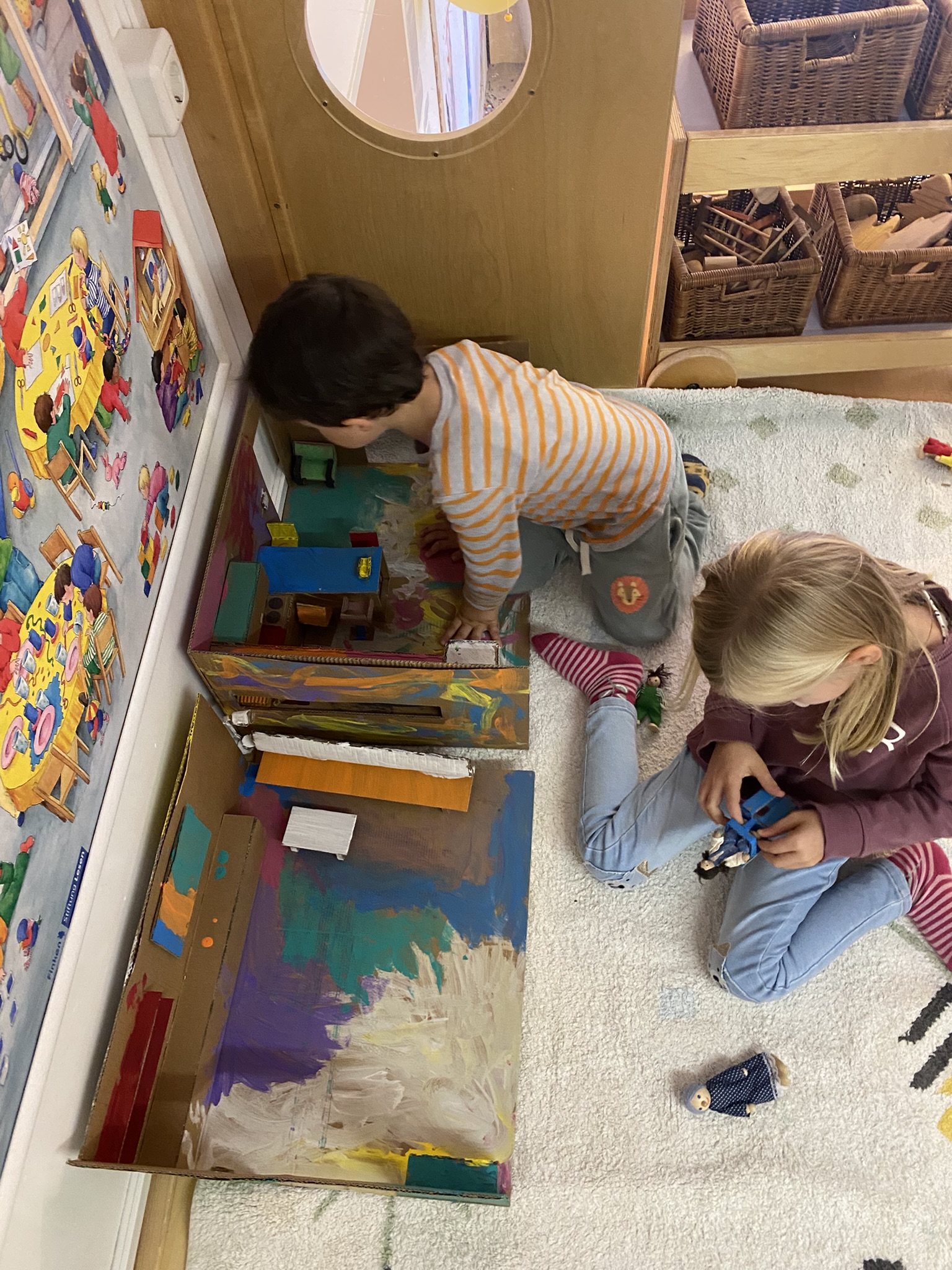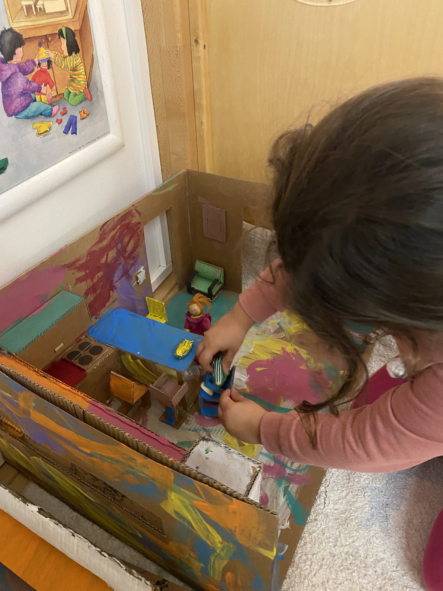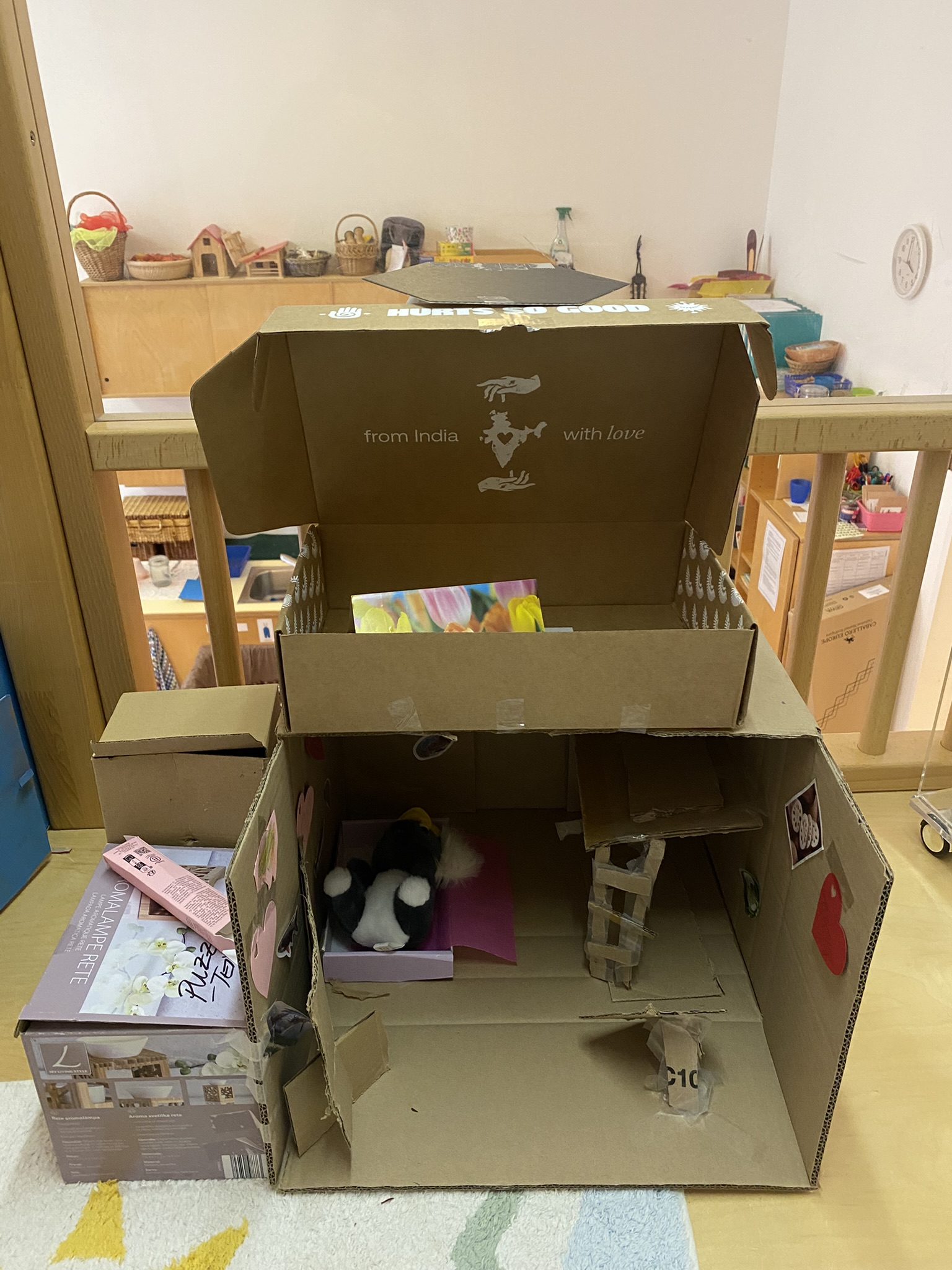 Heute, eine Woche später, haben wir einen geeigneten Platz für die Puppen-Wohnung gefunden. Schon gleich wird sie von den Kindern bespielt und es ist sogar schon jemand eingezogen.