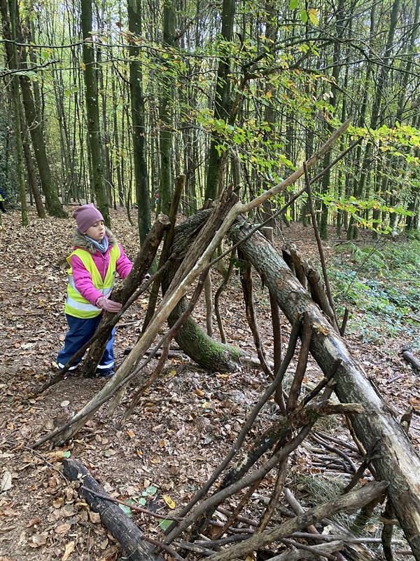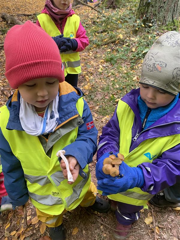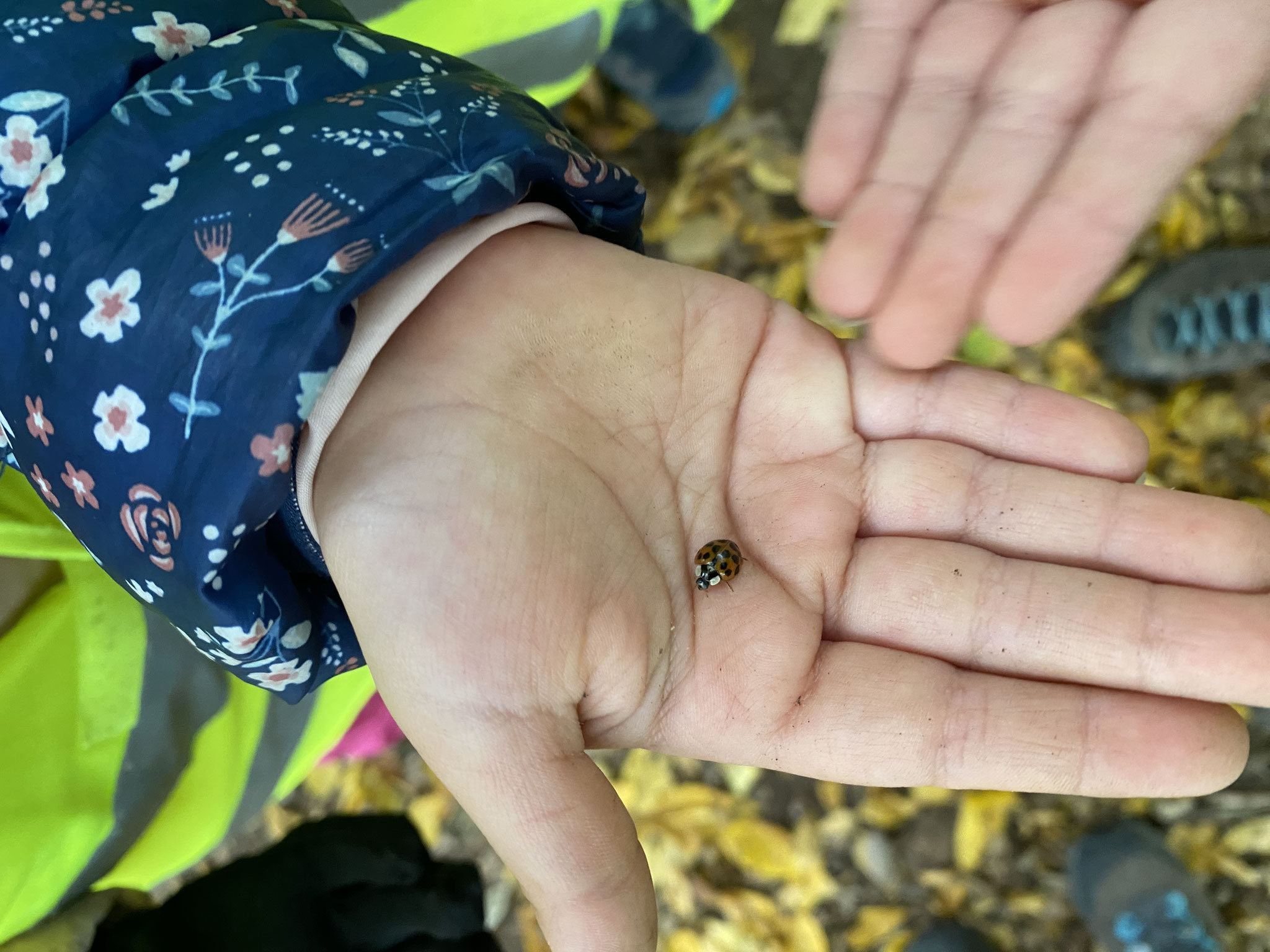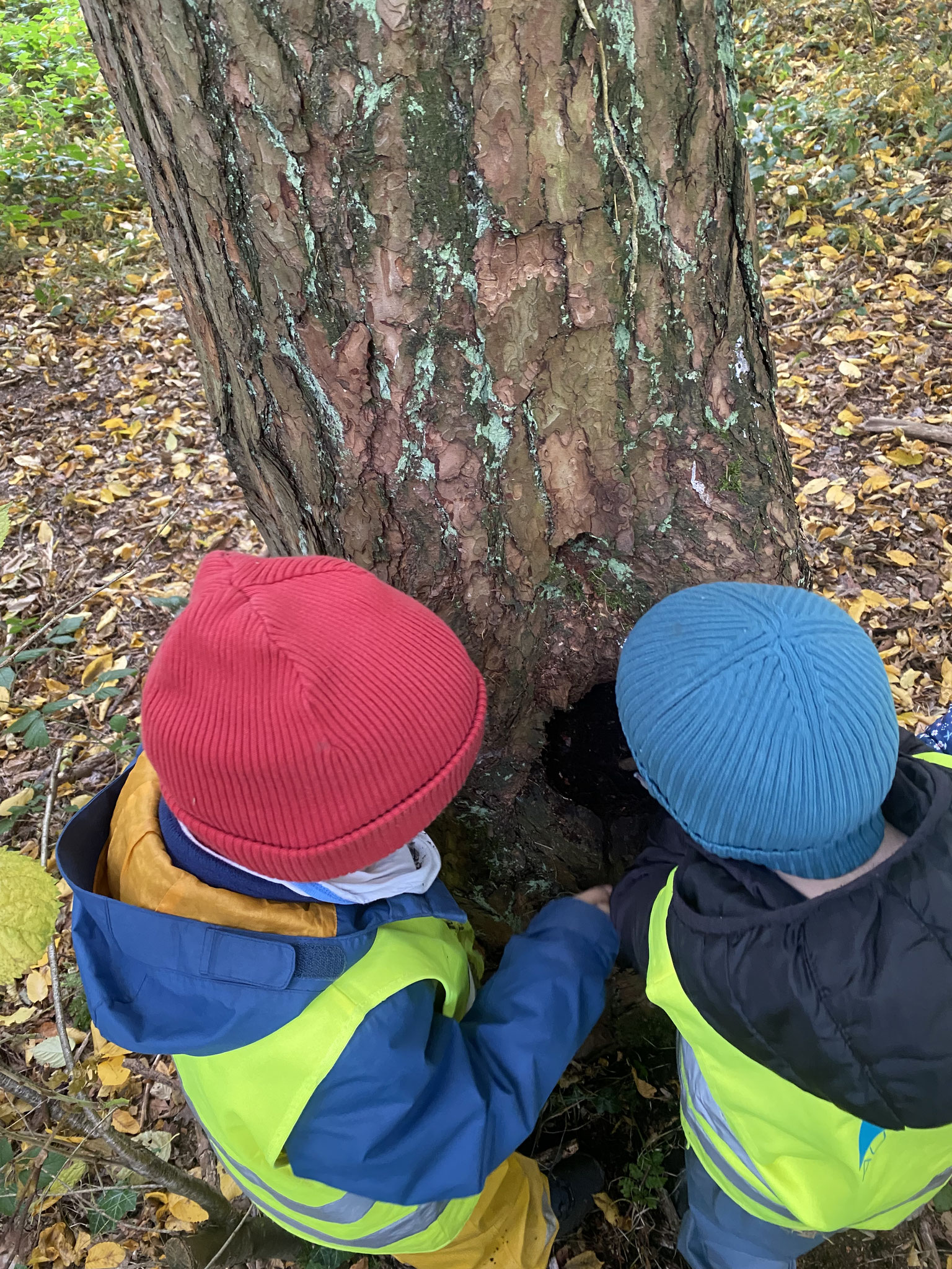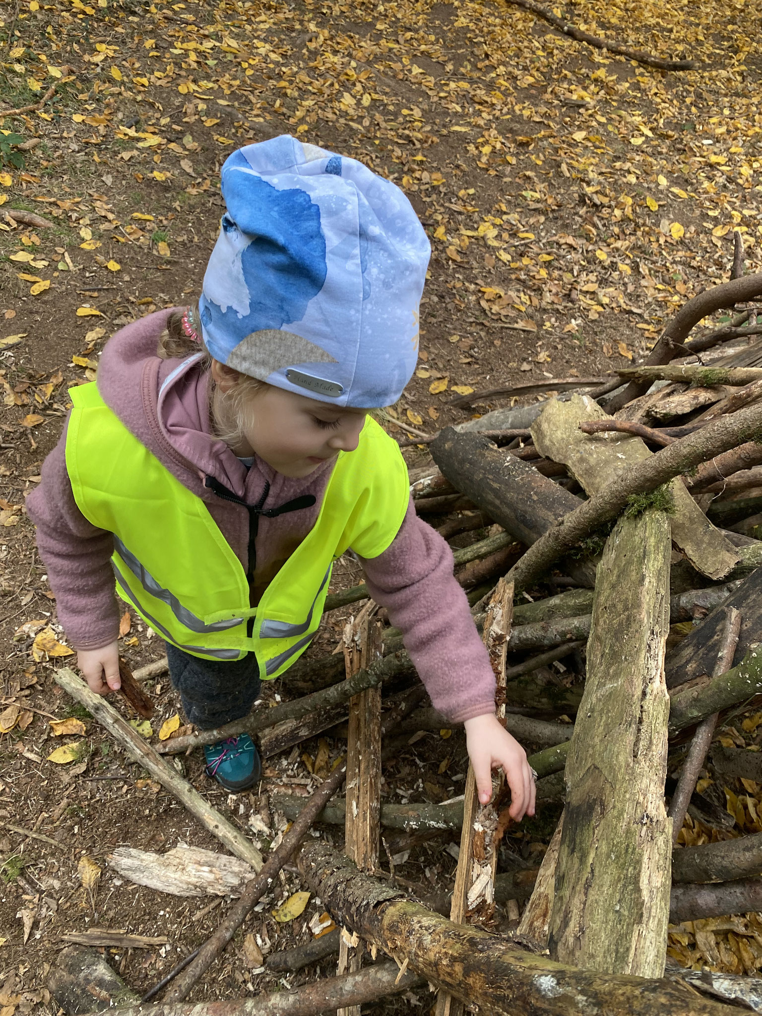 Manche Kinder transportieren Pilze mit Stöcken in ein Lager, damit sie sie nicht direkt angreifen müssen (könnte ja sein, dass sie giftig sind). Andere Kinder bauen Häuser und Tipis. Dabei wird das Haus lackiert und Futter für die Hühner verstreut. Es entstehen verschiedene Rollenspiele. Eine Gruppe entdeckt ein großes Loch in einem Baum, in dem sie Erde und Tiere finden. Ein Tier davon ist der Laufkäfer Fritz – aber wo ist nur seine Mama Frieda? Die Kinder denken sich Geschichten aus. Jemand findet ein „Waldmesser“, das sich super zum Pilze aufschneiden eignet. Es wird gekocht.