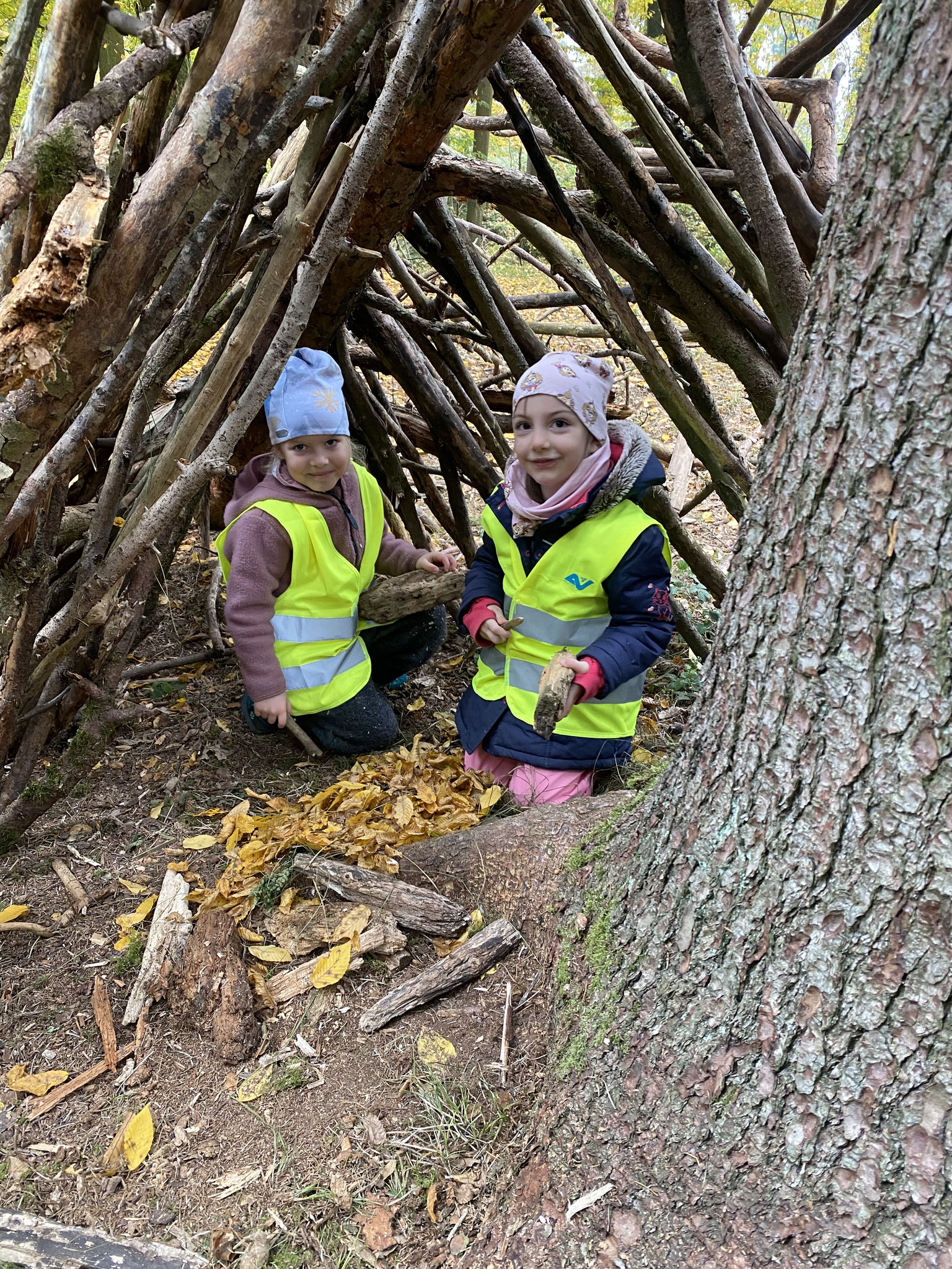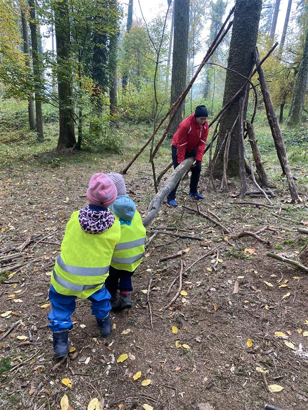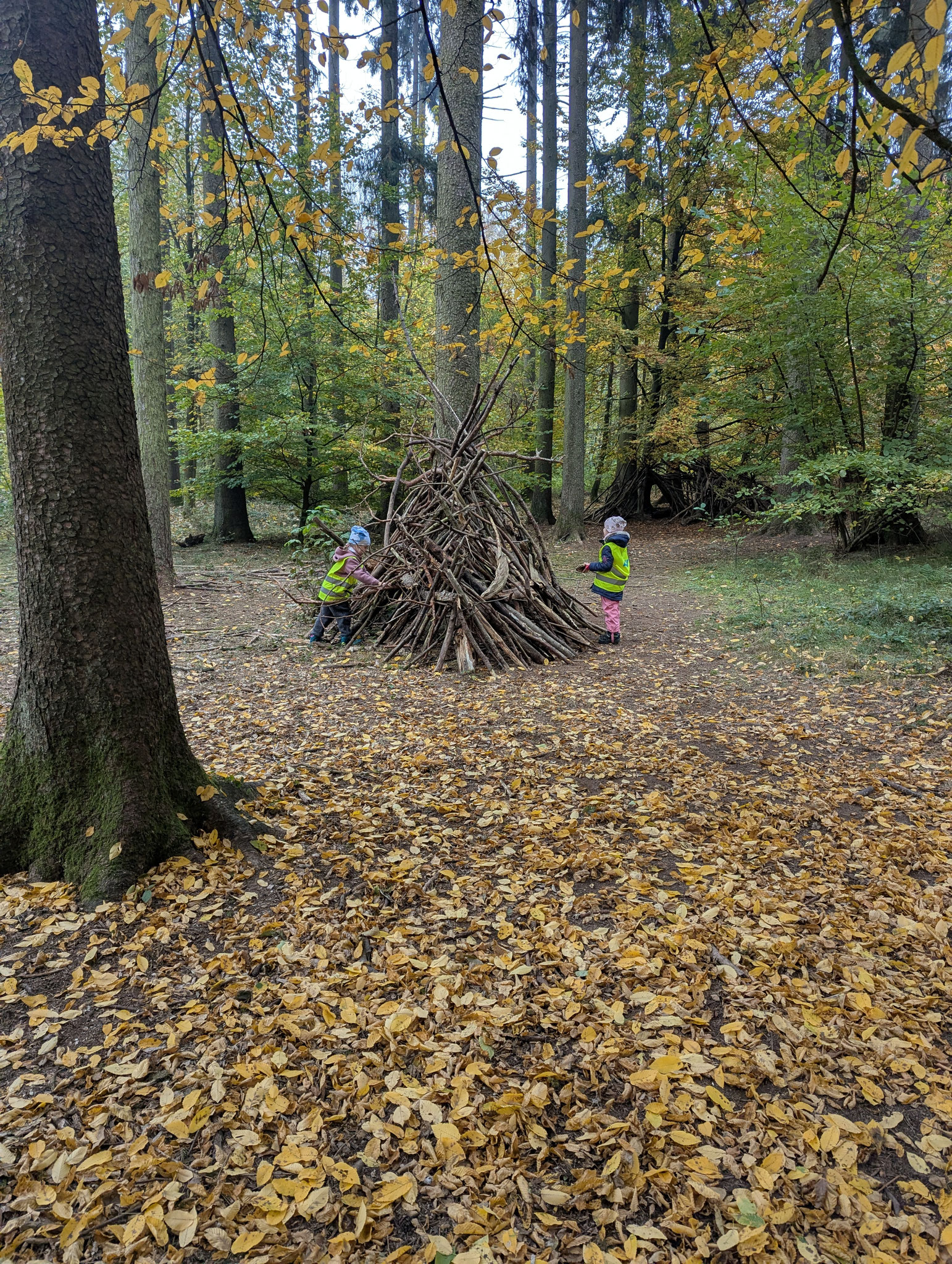 Endlich ist Spielen, freies Spielen im Wald angesagt. Es werden Tippies und Zwergenhäuser gebaut, es wird gesägt, gesammelt und entdeckt. Die Kinder sind eifrig im Tun und die Zeit vergeht wie im Flug.