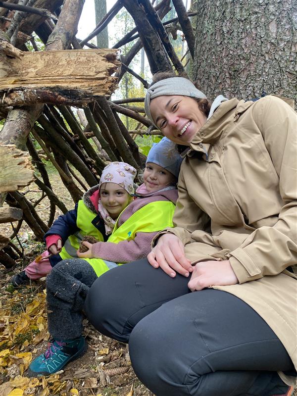 Eine Überraschung gibt es jedoch: heute wartet die Waldpädagogin Claudia auf uns in der Waldschule. Sie hat ein paar Tiere (Handpuppen) dabei, die sie uns vorstellt: den Maulwurf Talpino, die Maus Trudi und die Vogelfamilie. Claudie erklärt uns, dass sie immer dabei sind, wenn sie im Wald ist.