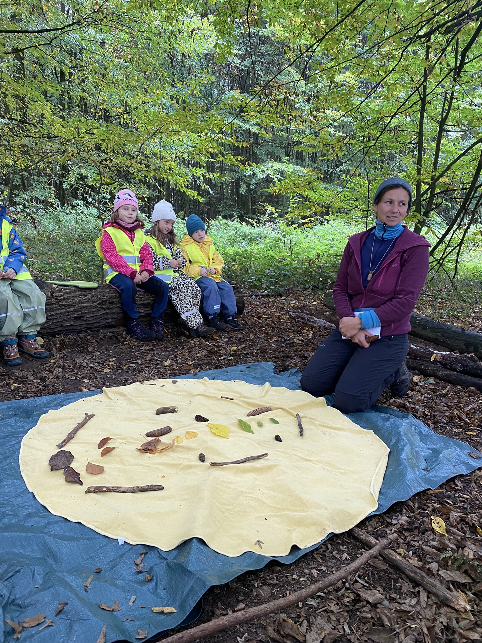 Zum Abschluss erklärt uns Eva noch, warum sich die Blätter im Herbst eigentlich verfärben. Dann singen wir das Lied “Für die Erde singen wir” und ein schöner erster Waldtag geht zu Ende.